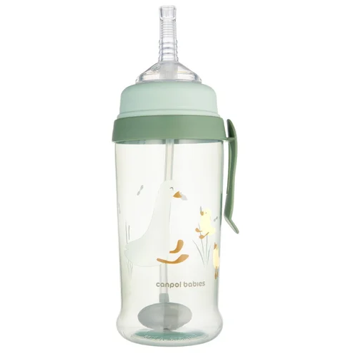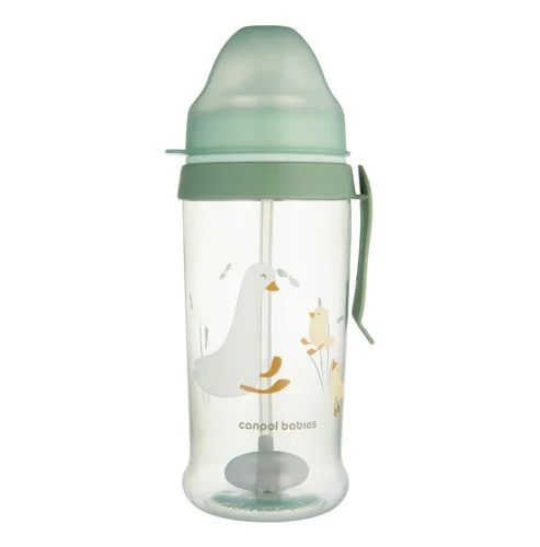 Rurka jest wykonana z miękkiego silikonu, więc dziecko może bezpiecznie doskonalić umiejętność samodzielnego picia. Bidon Canpol z odważnikiem 350 ml nie zawiera BPA ani innych szkodliwych substancji. Można myć go w zmywarce i podgrzewać w kuchence mikrofalowej. Canpol bidon niekapek z rurką i odważnikiem 350 ml wyposażony w wygodny uchwyt umożliwiający przymocowanie go do torby lub paska, dzięki czemu idealnie sprawdzi się w podróży. Bidon niekapek z rurką z odważnikiem jest rekomendowany dla dzieci od 9 miesiąca życia.