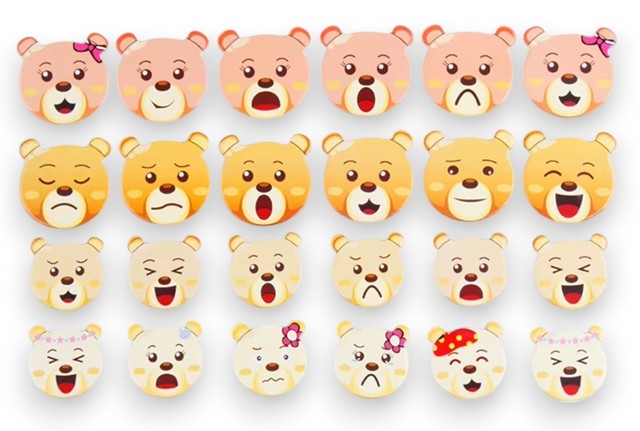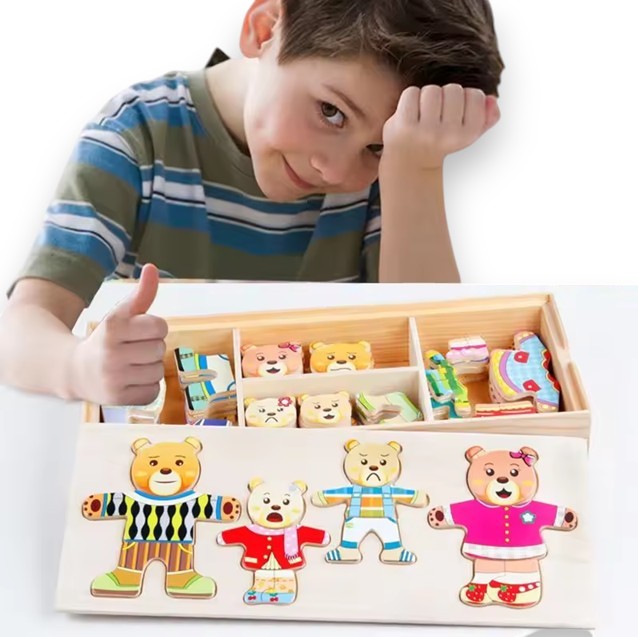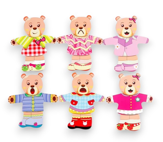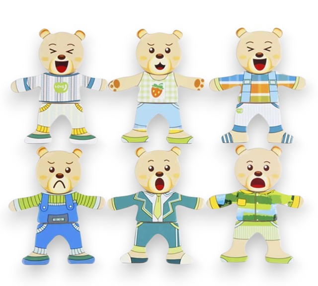Każdy miś posiada wymienne elementy, w tym różne buźki ukazujące emocje, co pozwala na naukę rozpoznawania i nazywania uczuć.