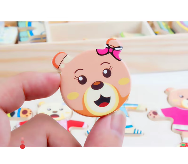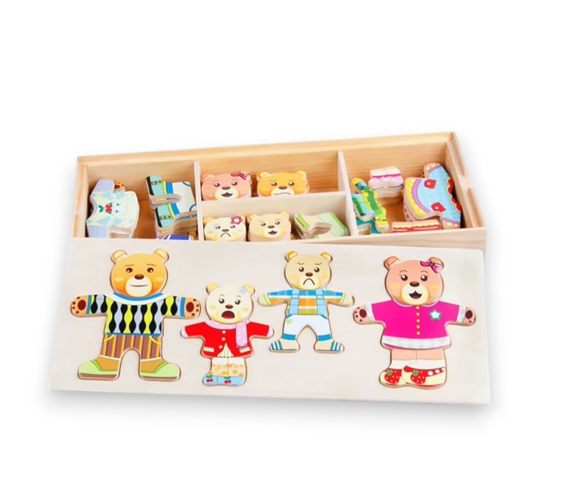 Zestaw składa się aż z 72 elementów, w tym dużych misiów (mama i tata) oraz dzieci (chłopców i dziewczynek), które można układać w specjalnie wyprofilowanych miejscach na wieczku pudełka lub na dowolnej powierzchni.