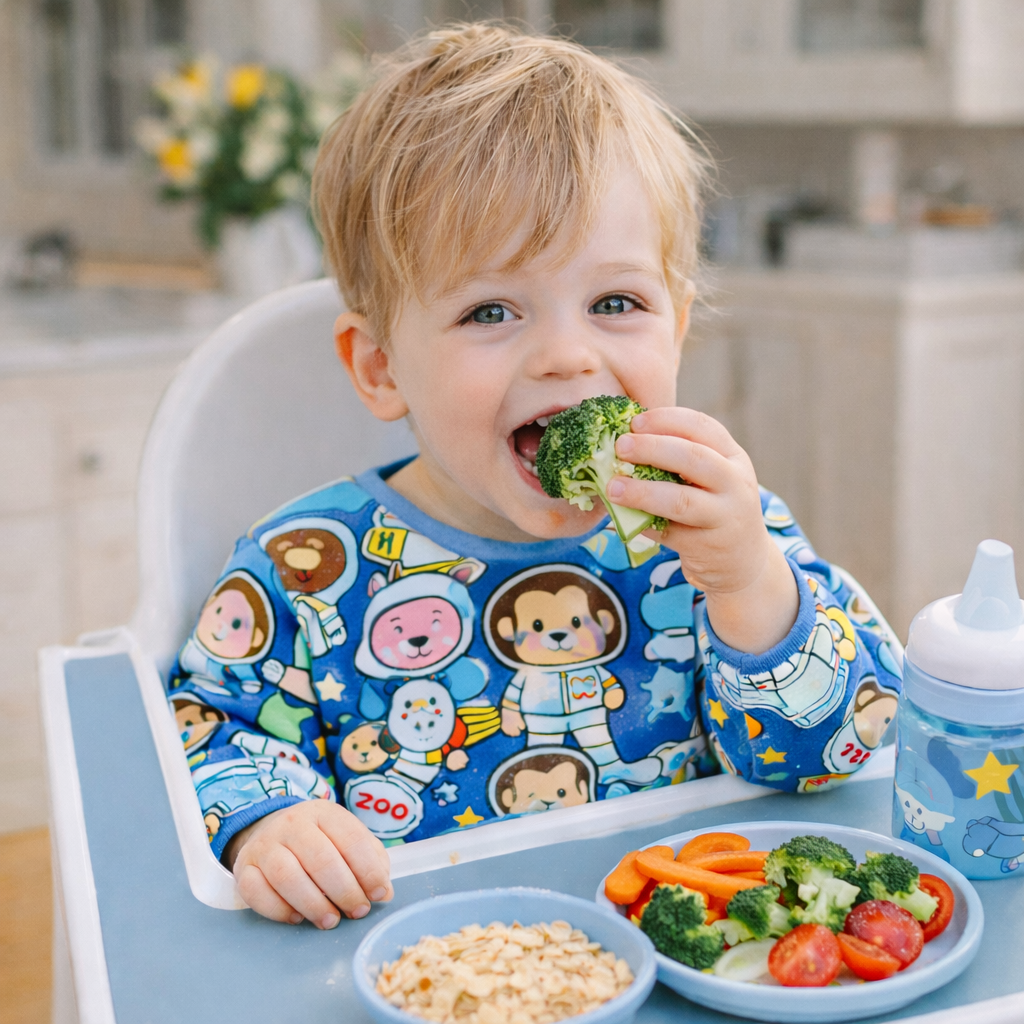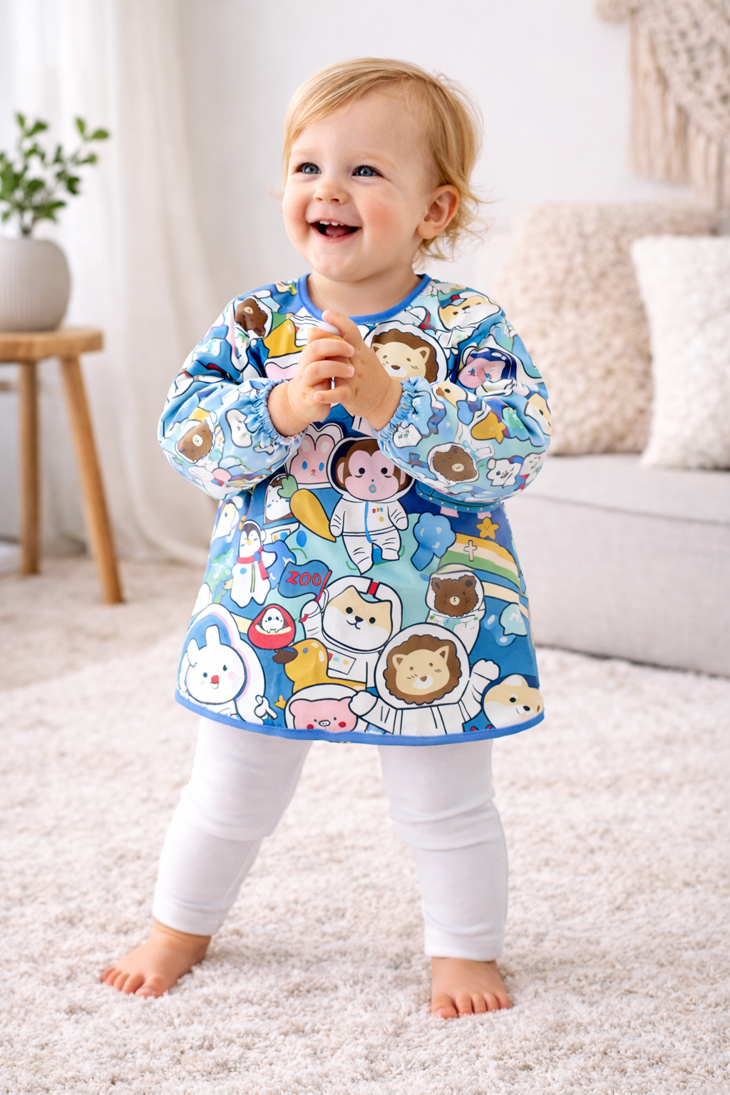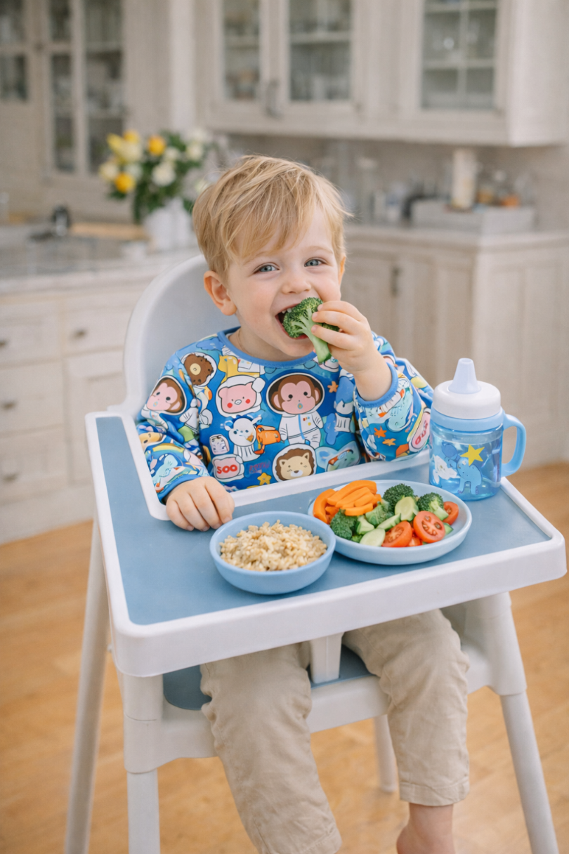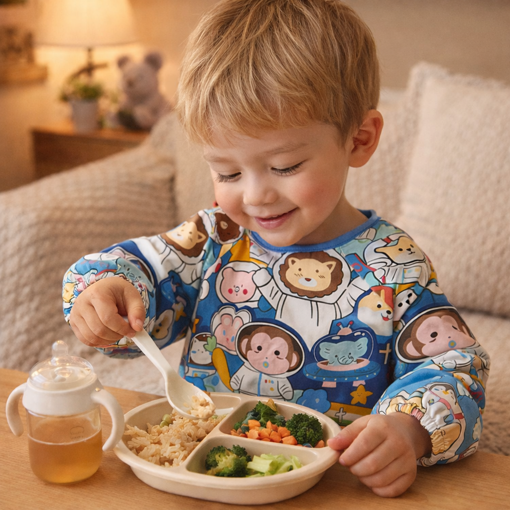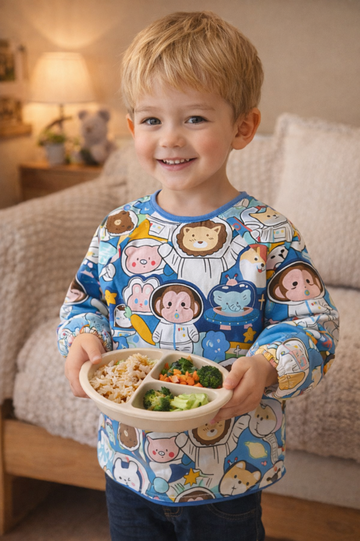 Elegancki śliniak z długim rękawem, wykonany z oddychającego materiału, który zabezpiecza ubrania dziecka przed zabrudzeniem podczas posiłków i zabawy.