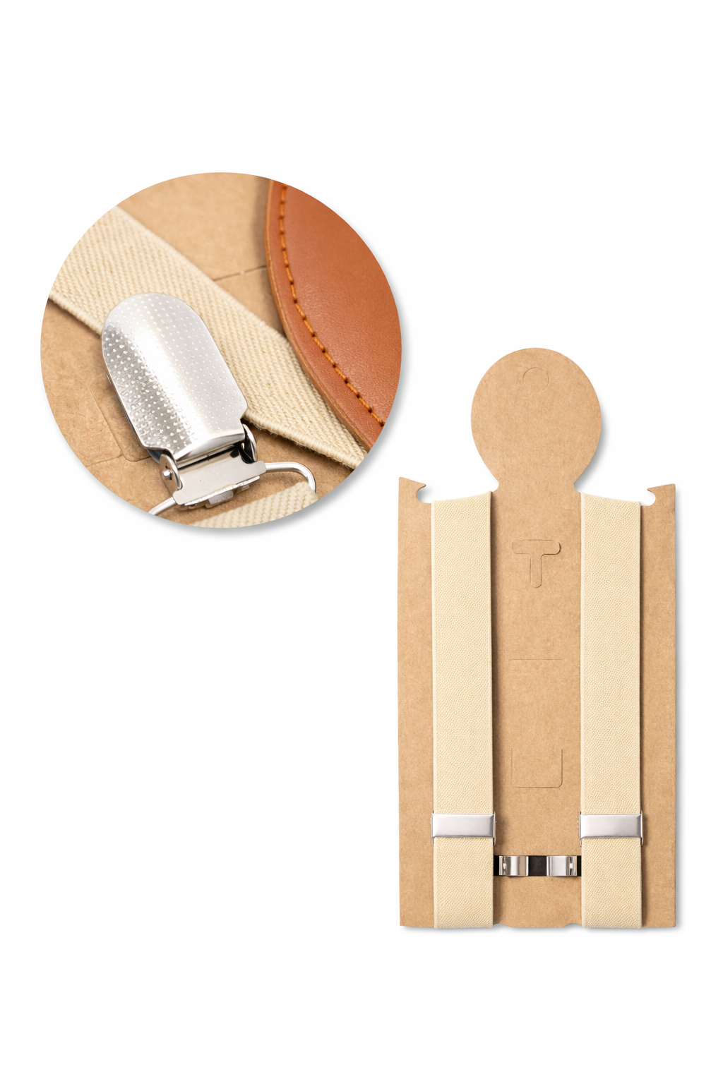 Szelki wykonano z wysokiej jakości gumy galanteryjnej oraz miękkiej, trwałej skóry ekologicznej. Klasyczne połączenie kolorów, skórzane detale i metalowe klamry nadają im vintage’owy charakter, który nigdy nie wychodzi z mody.