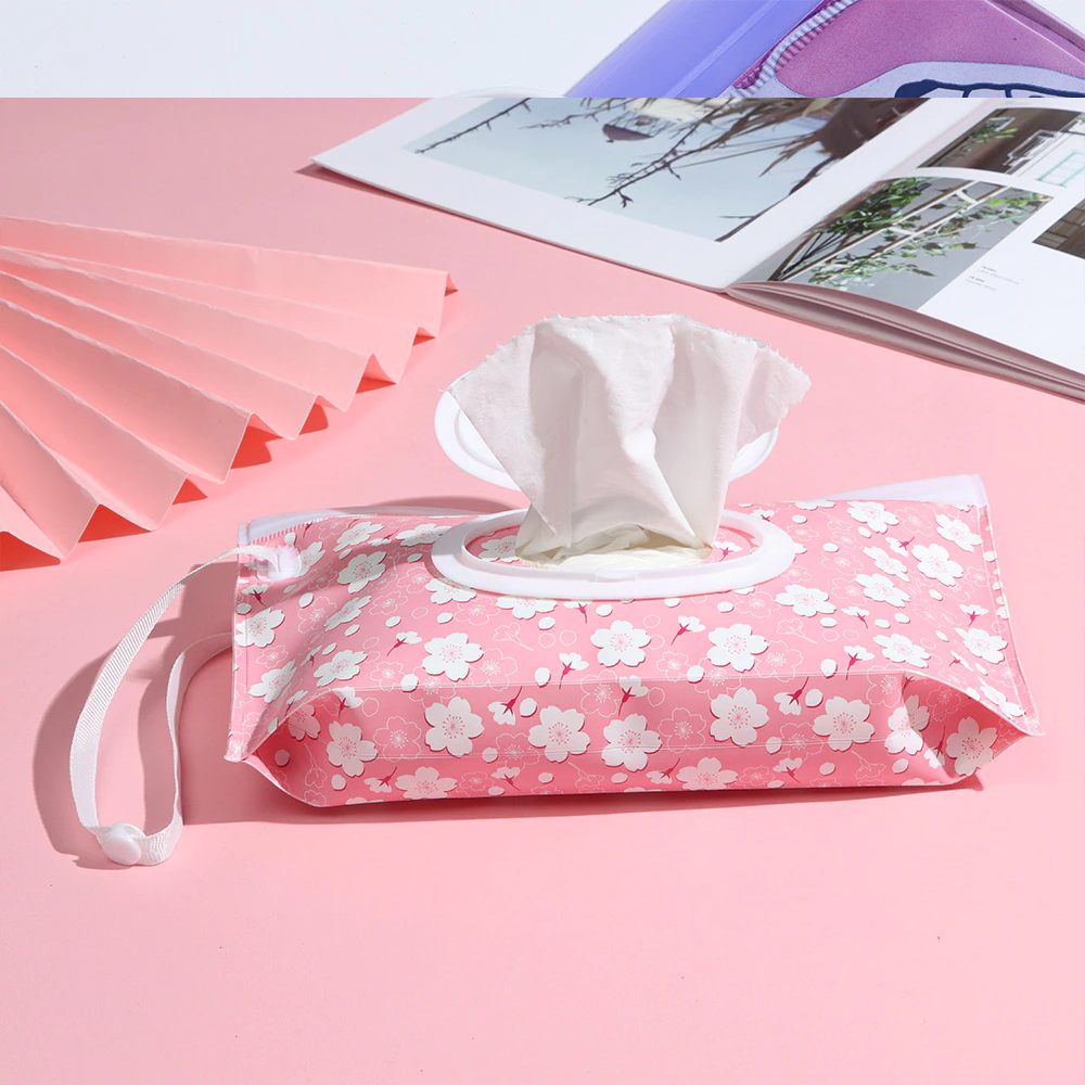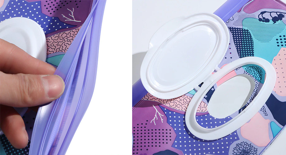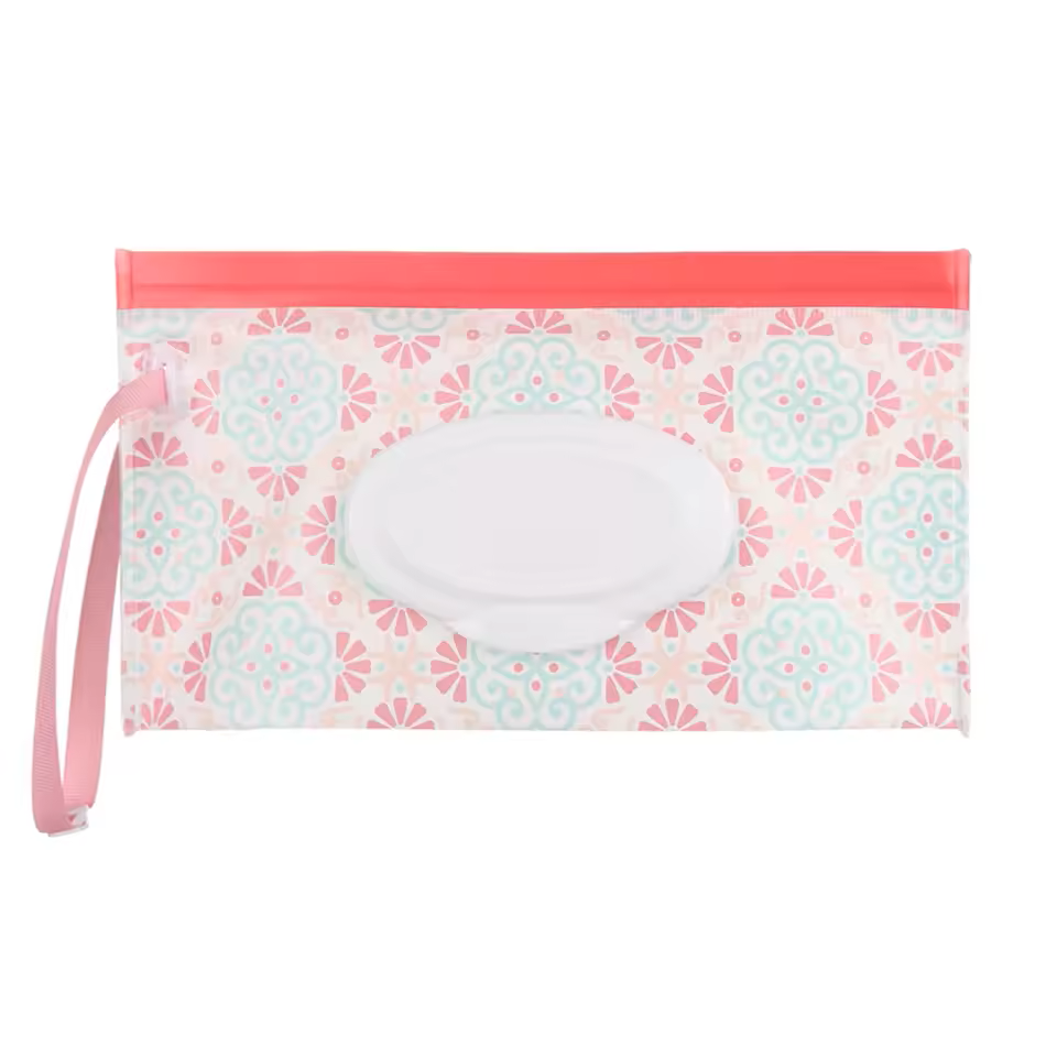Posiada bezpieczne, szerokie, szczelne zamknięcie, dzięki czemu chusteczki nie tracą wilgoci i zachowują świeżość za każdym razem, kiedy chcemy z nich skorzystać. Pojemnik został wyposażony w wygodny uchwyt, dzięki któremu możemy go łatwo trzymać w ręku, przymocować do wózka za pomocą nap lub po prostu wrzucić go do torby z pieluchami.